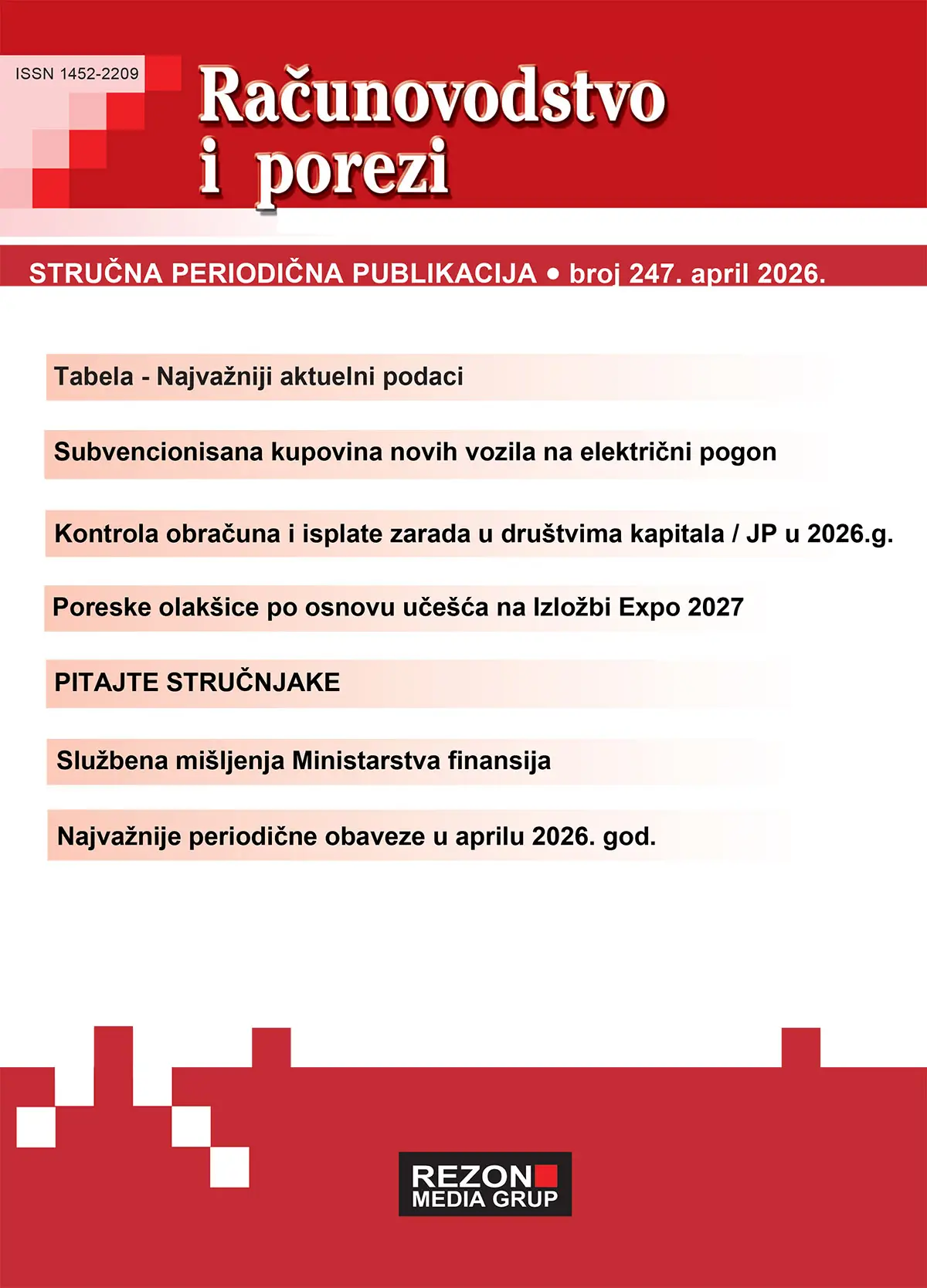 Časopis "Računovodstvo i porezi" izlazi jednom mesečno, prateći najaktuelnije promene u propisima koji se primenjuju u Republici Srbiji.